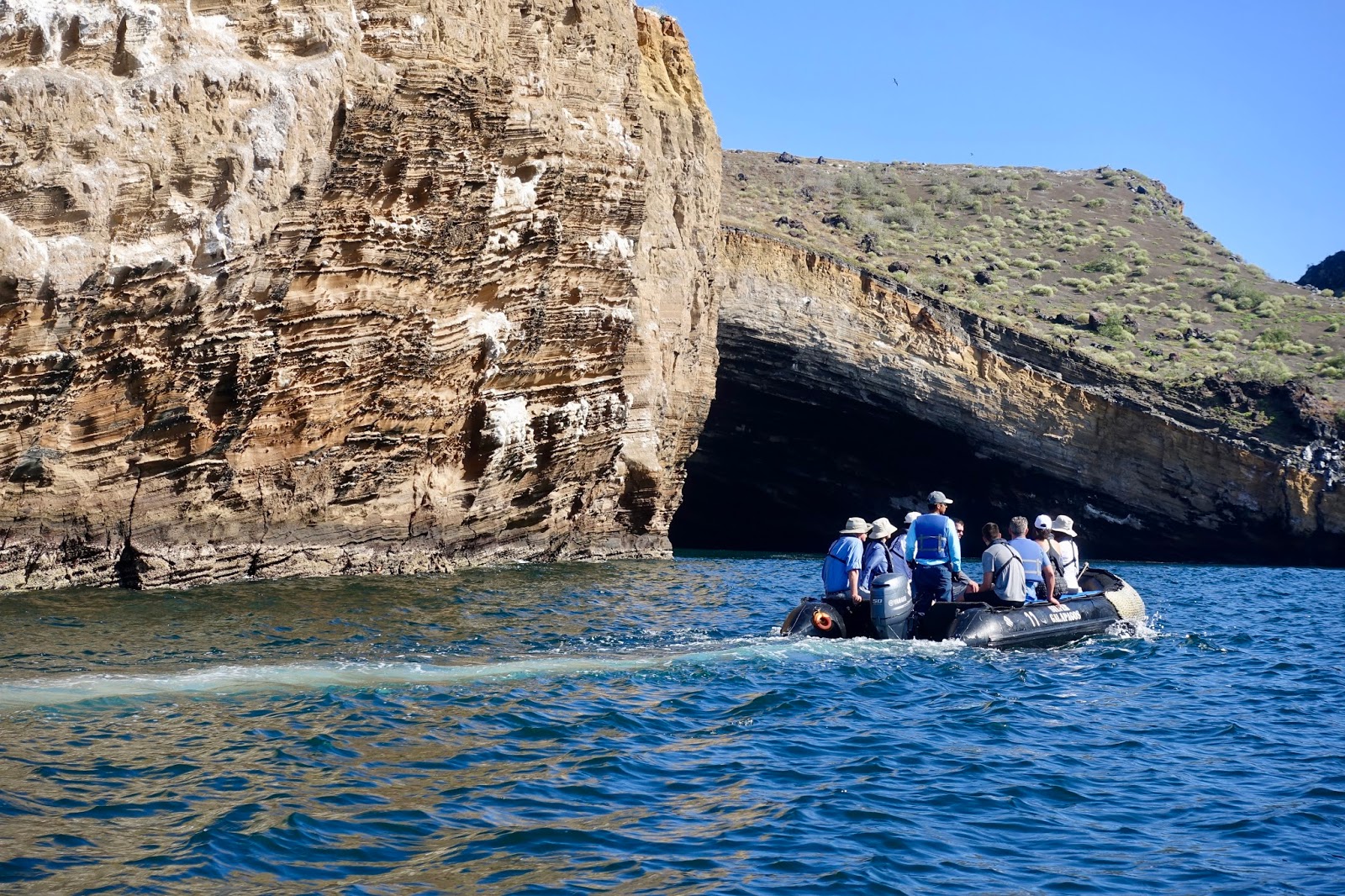 Finally, after the ship repositioned to Santiago Island, a Zodiac ride along the Caleta Bucanero allowed contemplating the beautiful landscape and sights of several species of boobies, green sea turtles, seals and marine iguanas.
